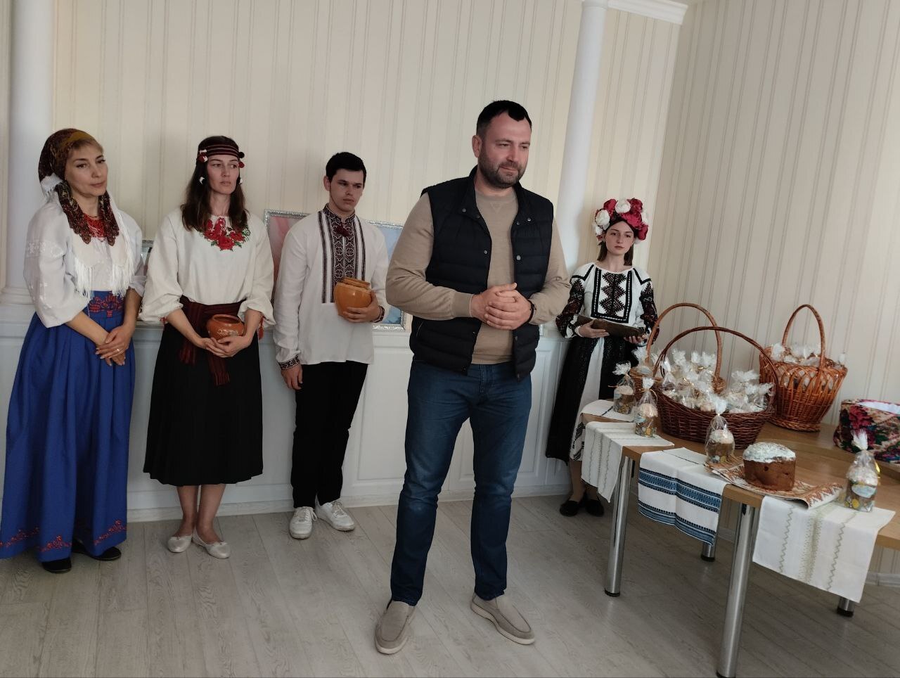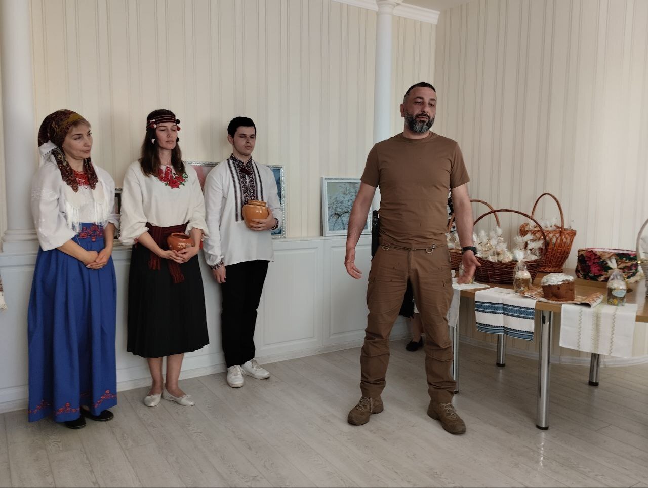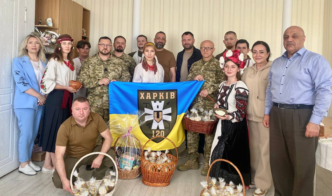 По его словам, для бойцов педагоги района подготовили и представили гостям литературно-музыкальную композицию «Пасха во время войны», а капеллан 120-го отдельного батальона Сил территориальной обороны ВСУ о. Владимир освятил куличи. Их передали воинам 5-й Слобожанской бригады Национальной гвардии Украины в лице капитана Артема Скрынникова и 120-го отдельного батальона 113-й бригады Сил ТРО в лице подполковника Герасима Геворгяна.